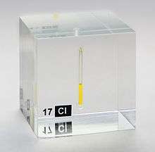 Chlorine is a chemical element with the symbol Cl and atomic number 17. The second-lightest of the halogens, it appears between fluorine and bromine in the periodic table and its properties are mostly intermediate between them. Chlorine is a yellow-green gas at room temperature. It is an extremely reactive element and a strong oxidising agent: among the elements, it has the highest electron affinity and the third-highest electronegativity on the Pauling scale, behind only oxygen and fluorine.