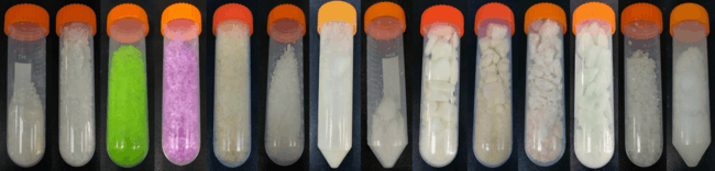 Samples of lanthanide nitrates in their hexahydrate form. From left to right: La, Ce, Pr, Nd, Sm, Eu, Gd, Tb, Dy, Ho, Er, Tm, Yb, Lu.