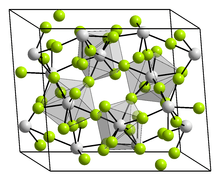 All four thorium tetrahalides are known, as are some low-valent bromides and iodides:[51] the tetrahalides are all 8-coordinated hygroscopic compounds that dissolve easily in polar solvents such as water.[52] Many related polyhalide ions are also known.[51] Thorium tetrafluoride has a monoclinic crystal structure like those of zirconium tetrafluoride and hafnium tetrafluoride, where the Th4+ ions are coordinated with F− ions in somewhat distorted square antiprisms.[51] The other tetrahalides instead have dodecahedral geometry.[52] Lower iodides ThI3 (black) and ThI2 (gold-coloured) can also be prepared by reducing the tetraiodide with thorium metal: they do not contain Th(III) and Th(II), but instead contain Th4+ and could be more clearly formulated as electride compounds.[51] Many polynary halides with the alkali metals, barium, thallium, and ammonium are known for thorium fluorides, chlorides, and bromides.[51] For example, when treated with potassium fluoride and hydrofluoric acid, Th4+ forms the complex anion ThF2−